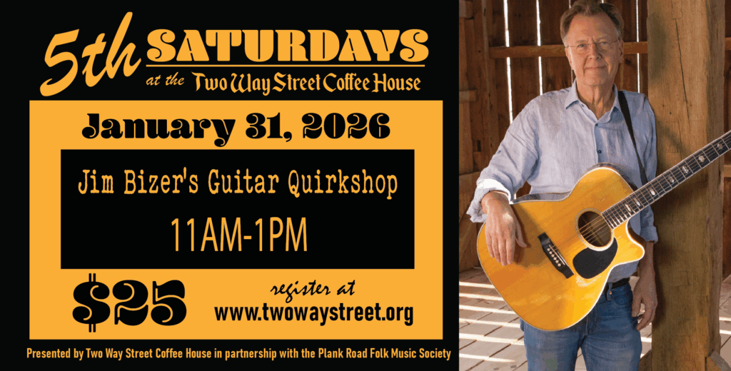 For our January event, Two Way Street Coffee House, in partnership with the Plank Road Folk Music Society, is pleased to present a guitar workshop with Jim Bizer on January 31, 2026 from 11am-1pm.