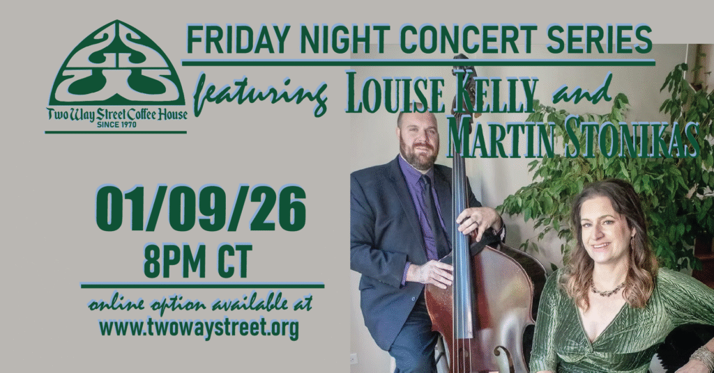 On Friday, January 9, 2026 Two Way Street Coffee House Friday Night Concert Series presents Louise Kelly and Martin Stonikas.