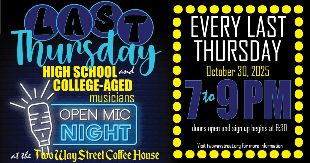 On October 30, 2025 at 7pm, step into the spotlight at Two Way Street Coffee House, one of the best-loved acoustic venues in the Chicago area. Whether you’re a singer-songwriter, poet, guitarist, or spoken word performer, this is your space to be heard.